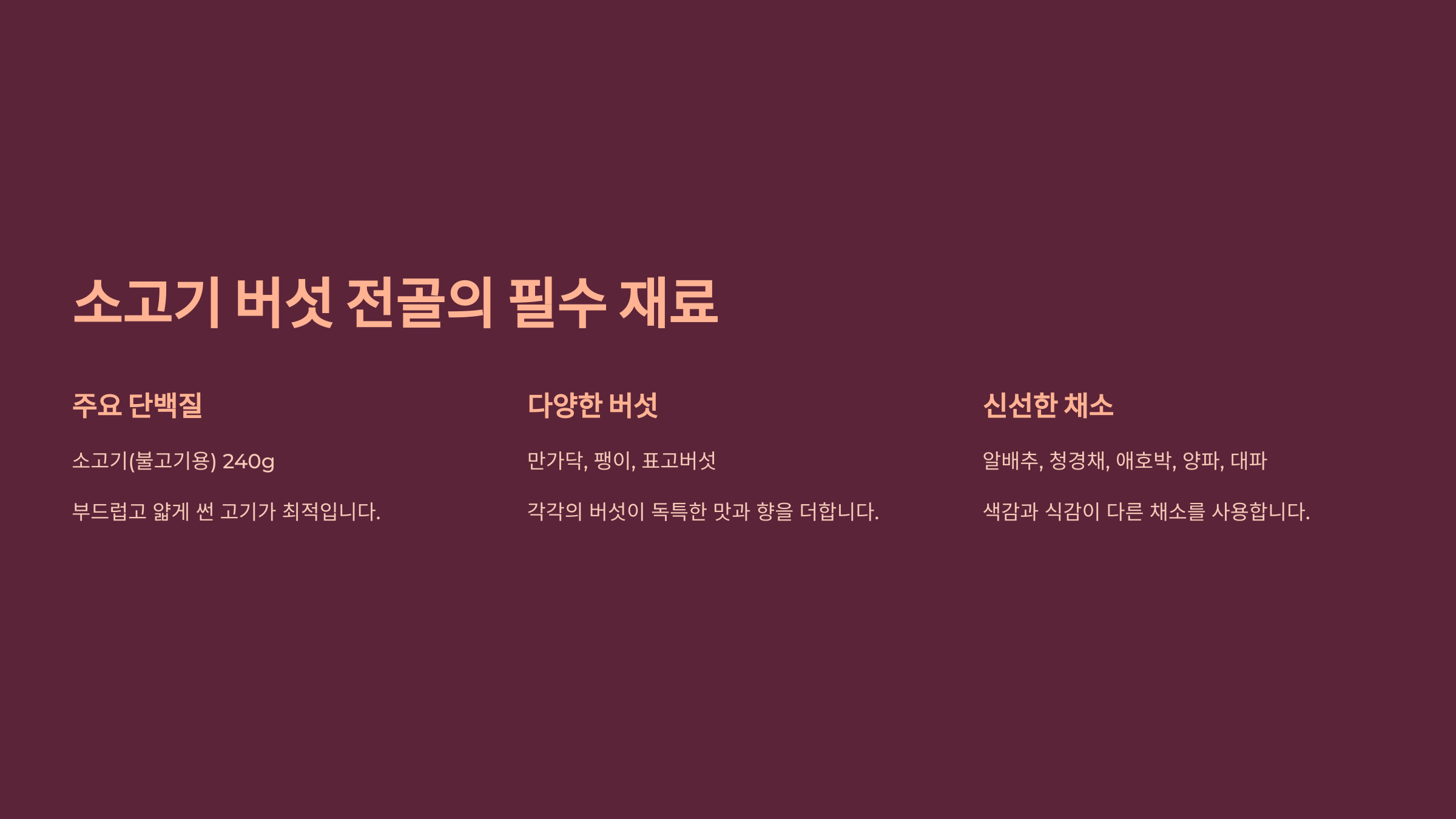 - 고기와 버섯의 조화를 극대화하는 건강한 전골!