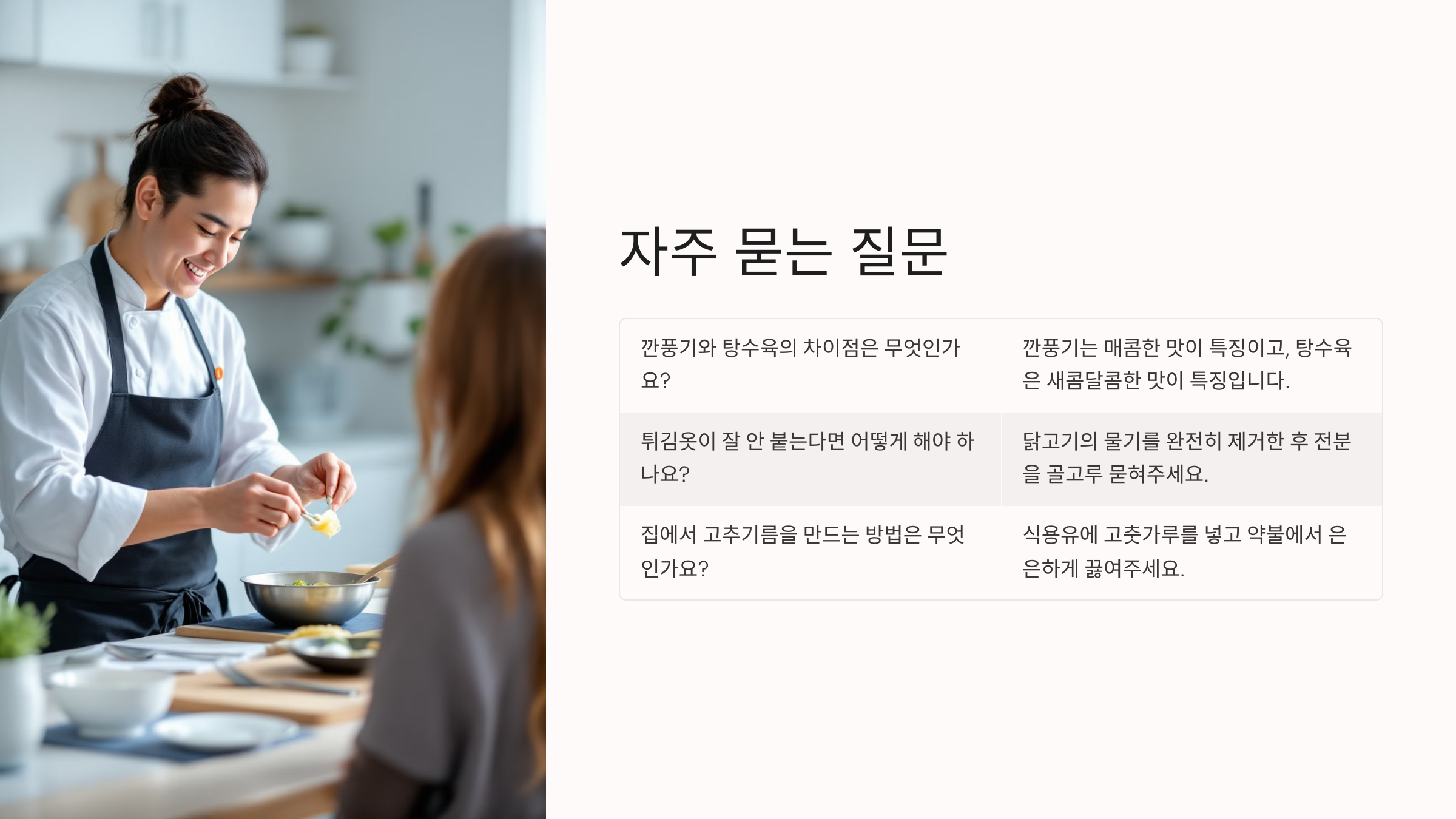 이제 깐풍기를 더 맛있게 먹는 방법까지 마스터했어요! 하지만 아직 궁금한 점이 있을 수도 있죠? 이제 자주 묻는 질문(FAQ)도 확인해볼까요? 🤔🍗