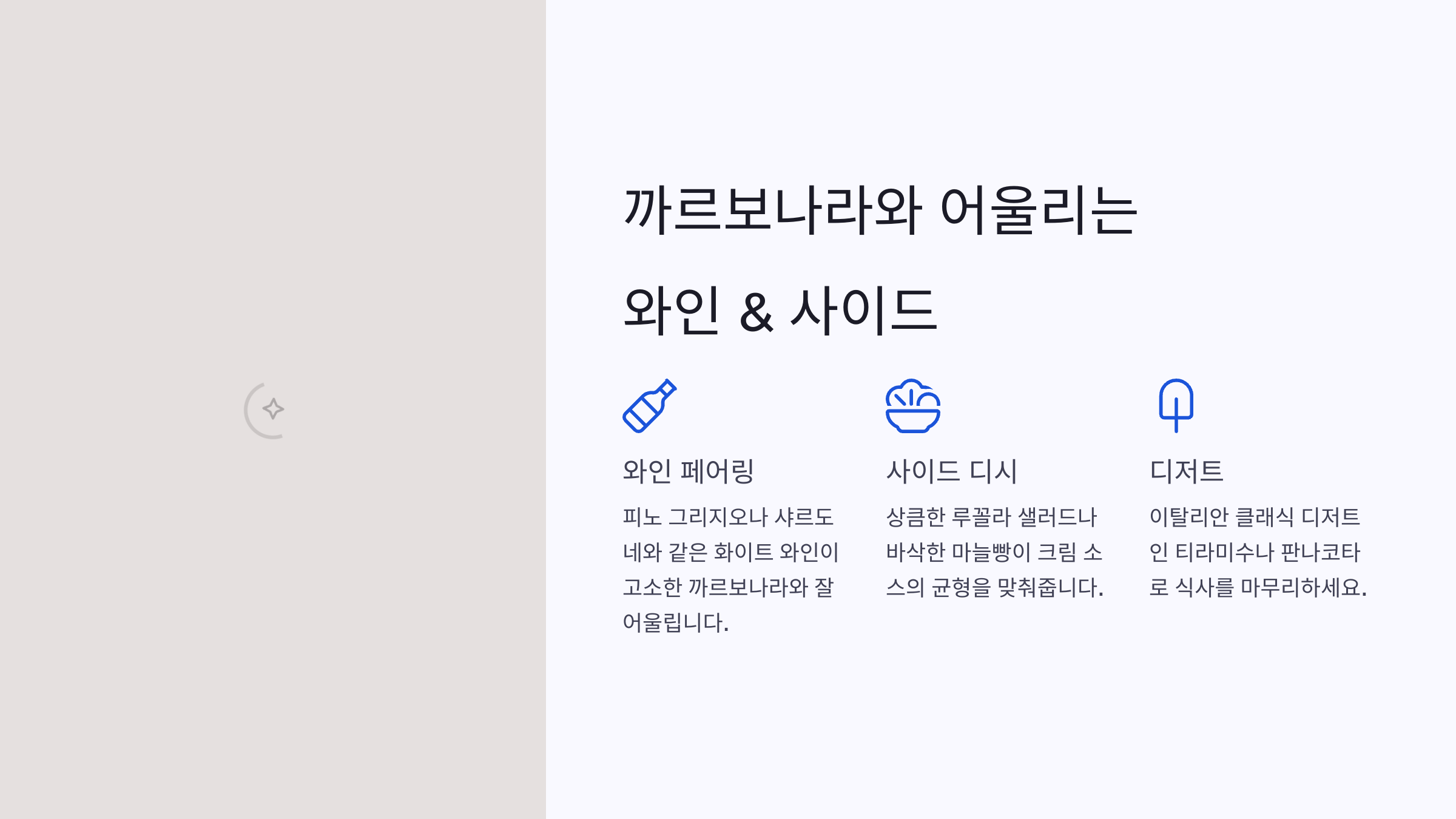 추천 항목 설명 화이트 와인 샤르도네, 소비뇽 블랑 레드 와인 가벼운 피노 누아 사이드 갈릭 브레드, 루꼴라 샐러드 와인과 곁들이면 까르보나라가 더욱 고급스러운 맛이 나요! 🍷