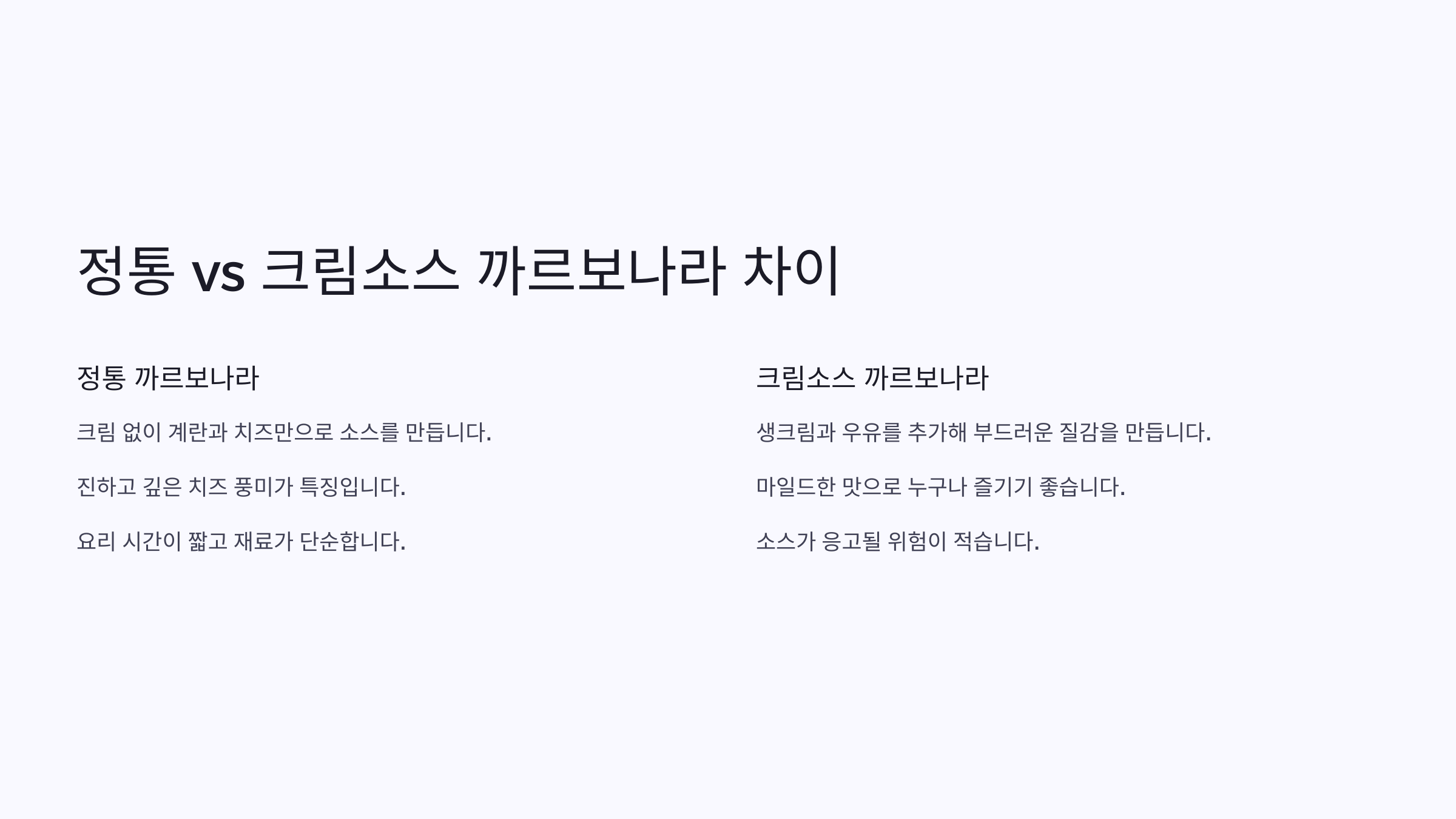 정통 까르보나라와 크림소스 까르보나라의 가장 큰 차이는 '소스의 농도'예요. 정통 방식은 계란과 치즈로만 농도를 맞추고, 크림소스 버전은 생크림과 우유를 사용해 좀 더 부드럽고 묽은 소스를 만들어요.