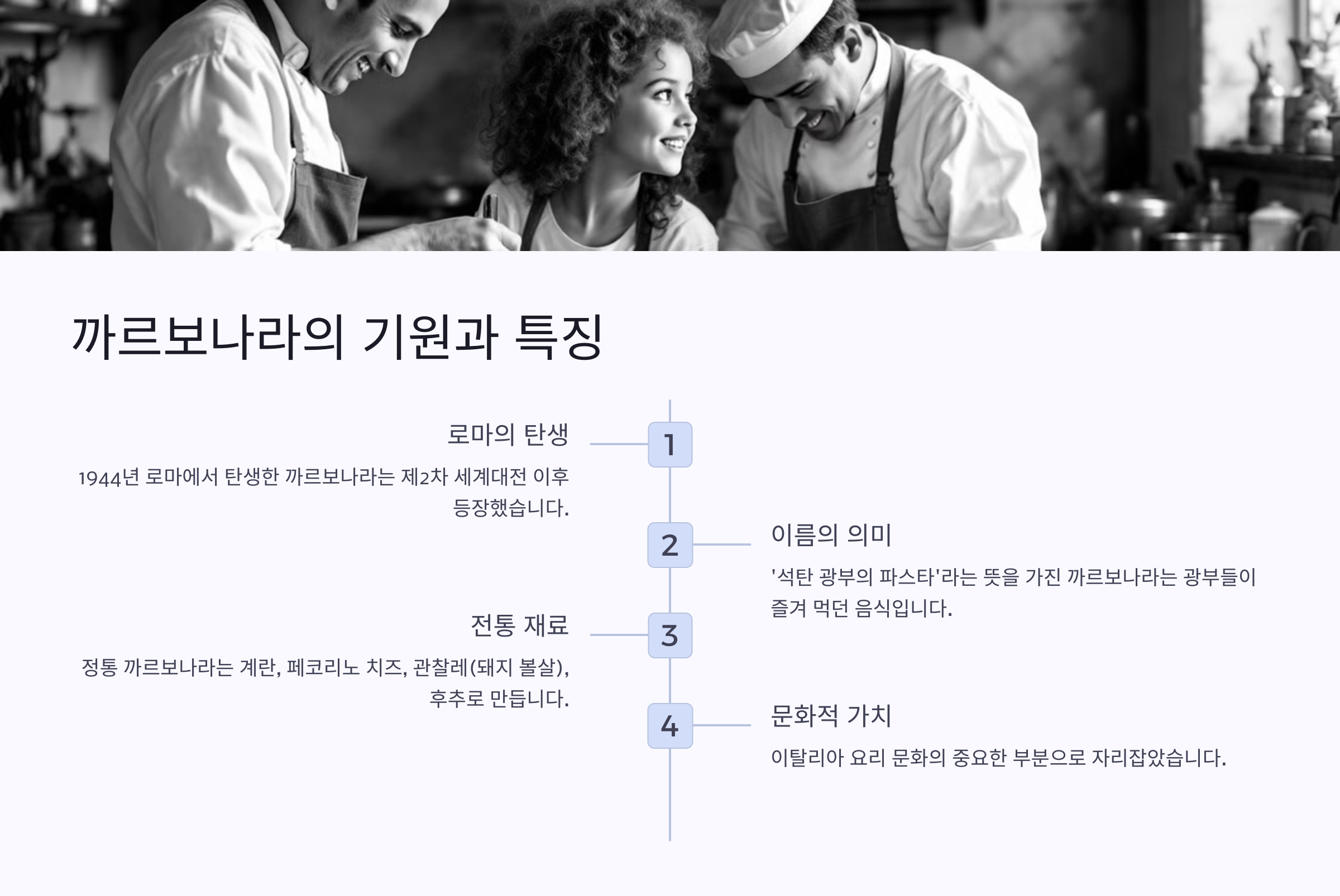 까르보나라는 이탈리아의 전통 파스타 요리로, 19세기경 로마 지역에서 시작되었어요. '까르보나라(Carbonara)'라는 이름은 '탄광 노동자'라는 뜻의 'Carbonaro'에서 유래했다는 설이 있어요. 당시 탄광 노동자들이 간편하게 먹기 위해 만들었다는 이야기가 전해지고 있어요.