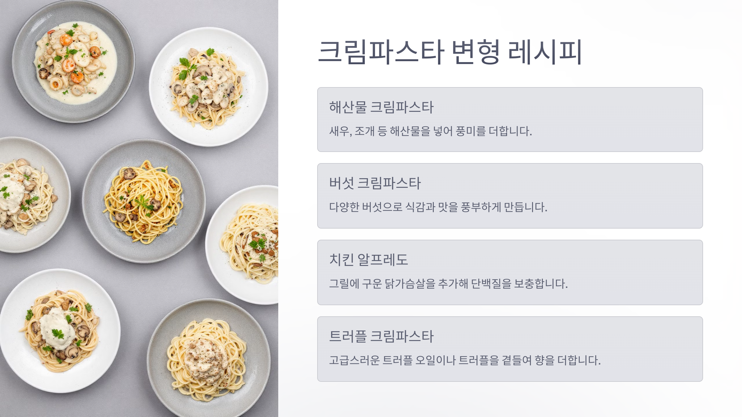 크림파스타는 기본 레시피도 맛있지만, 다양한 재료를 추가하면 색다른 맛을 즐길 수 있어요! 오늘은 특별한 재료를 활용한 크림파스타 변형 레시피를 소개할게요. 😊