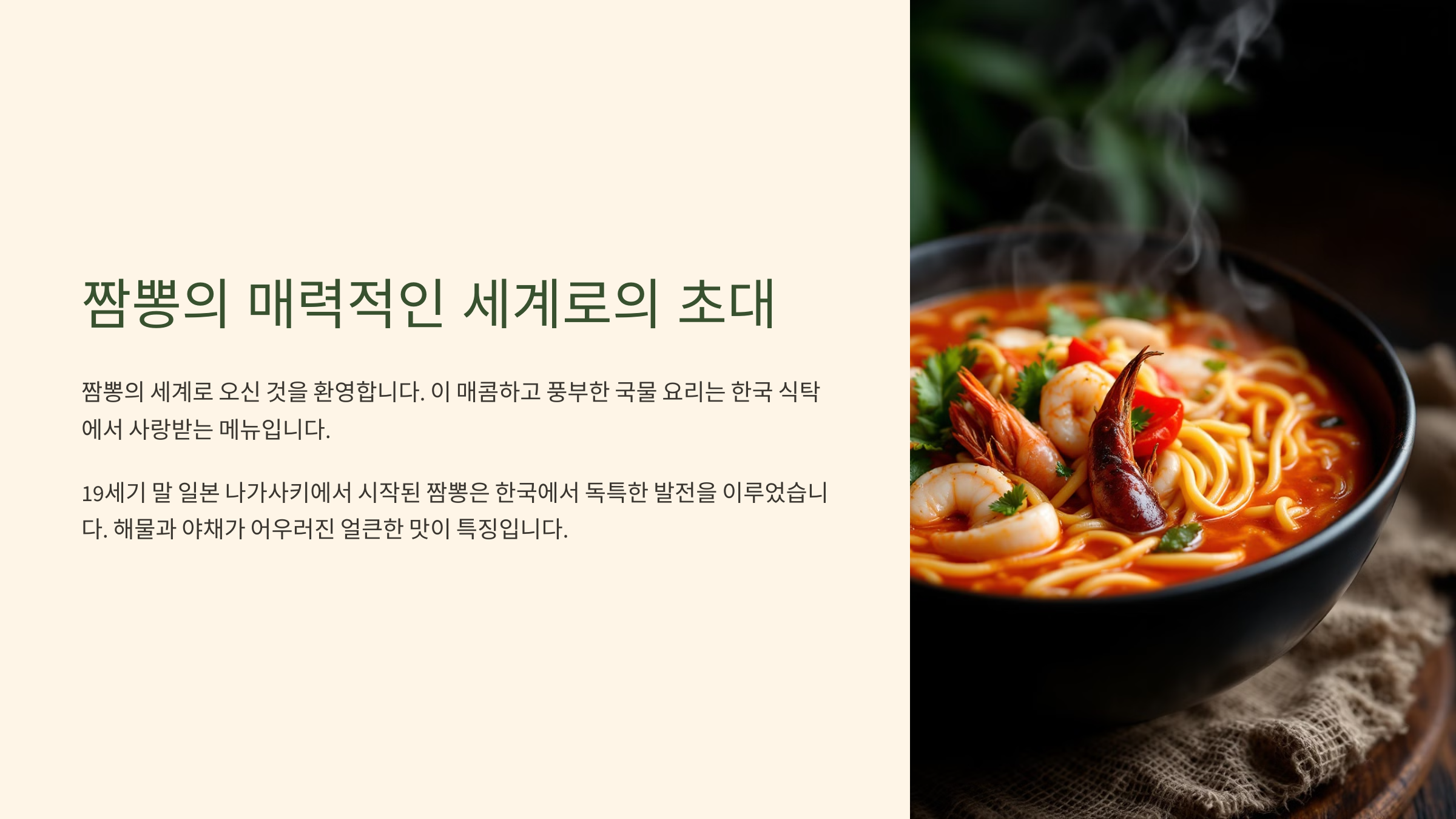 1900년대 초반, 한국의 중국집에서 해산물을 듬뿍 넣고 얼큰하게 끓이면서 지금의 한국식 짬뽕이 탄생했어요! 🍜🔥 특히, 강한 불맛과 얼큰한 국물이 특징이죠. 😊
