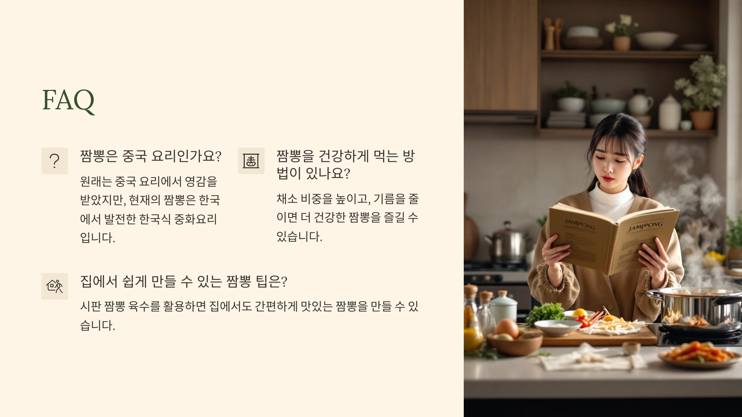 이제 짬뽕을 더 맛있게 먹는 방법까지 마스터했어요! 하지만 아직 궁금한 점이 있을 수도 있죠? 이제 자주 묻는 질문(FAQ)도 확인해볼까요? 🤔🍜