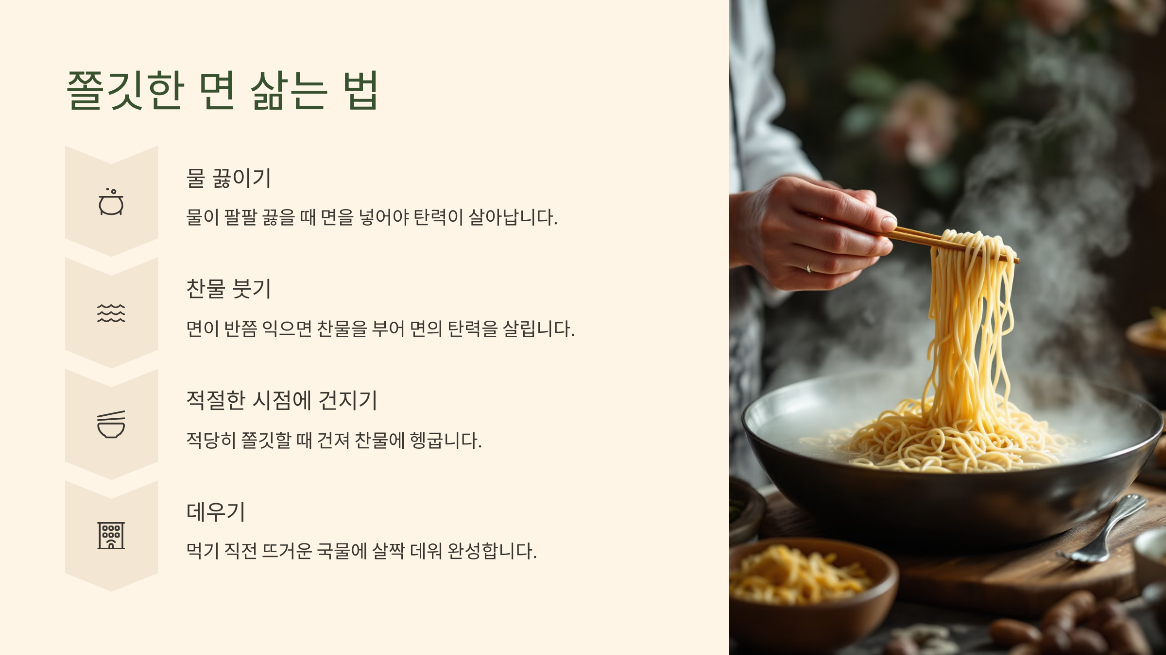 짬뽕의 국물이 아무리 맛있어도, 면이 퍼지면 맛이 반감돼요! 쫄깃한 식감을 유지하는 면 삶는 법을 제대로 배워볼까요? 🍜🔥