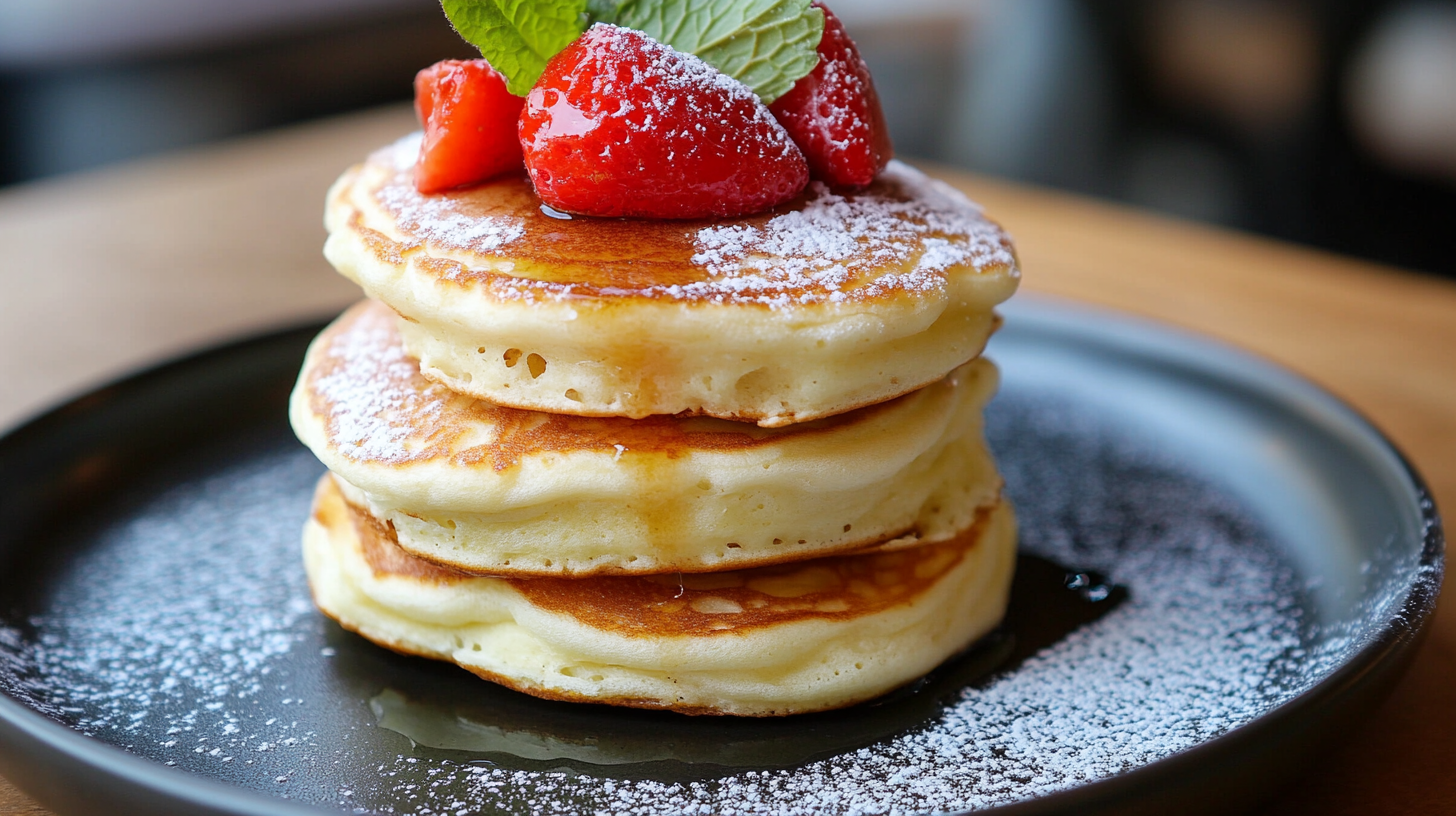 수플레 팬케이크는 일본 스타일의 팬케이크로, 거품을 낸 계란 흰자로 반죽을 만들어 폭신하고 가벼운 식감을 자랑해요. 🎈
