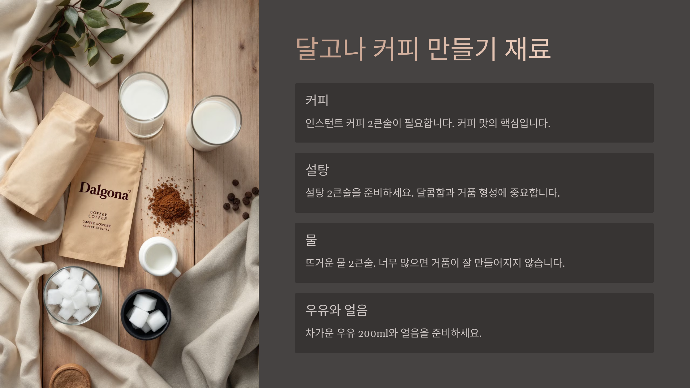 이제 달고나 커피를 만들기 위한 기본 재료를 알아볼까요? ☕🔥