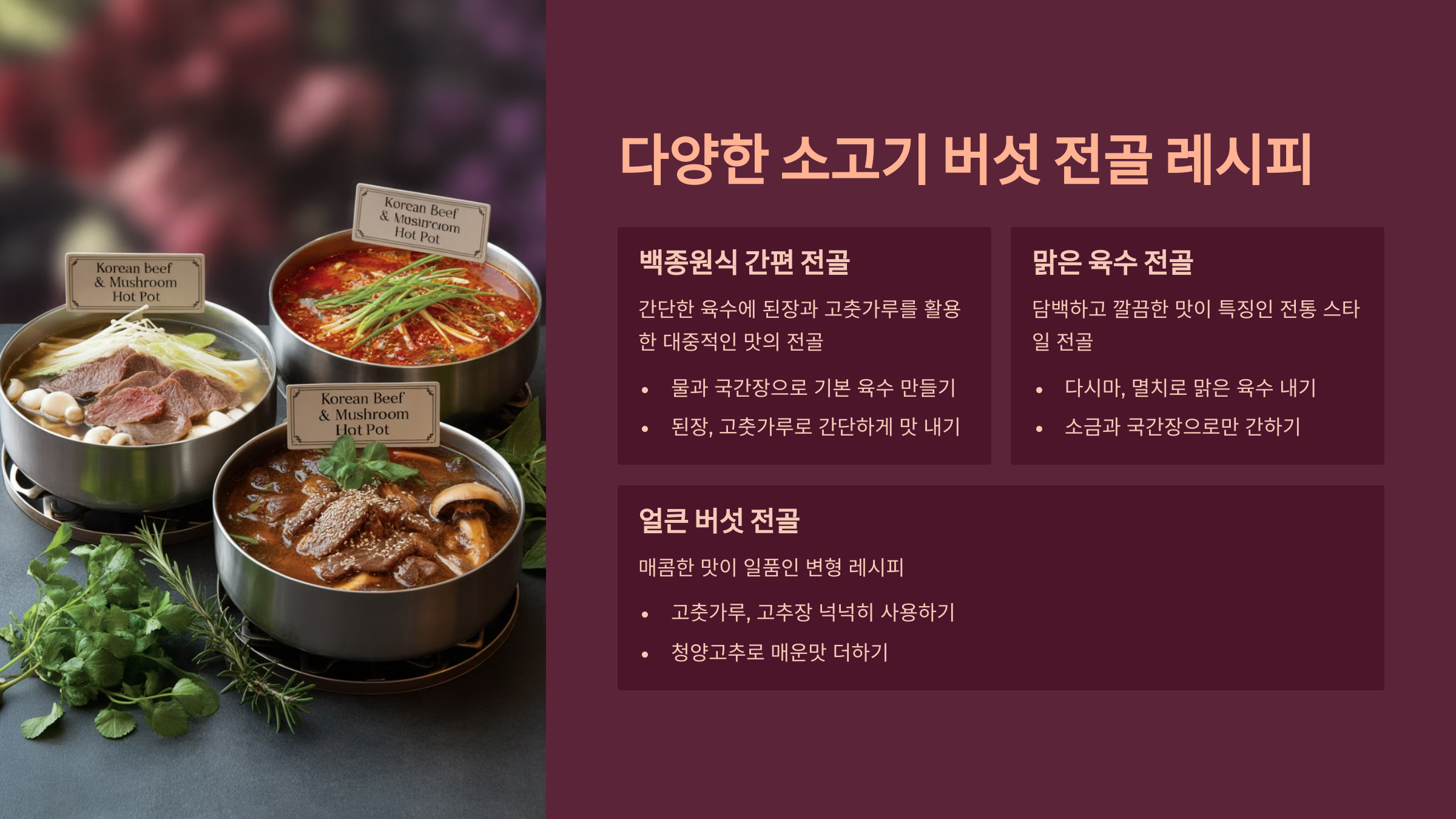 소고기 버섯 전골은 기본 레시피만 따라 해도 맛있지만, 몇 가지 팁을 활용하면 더욱 깊고 감칠맛 나는 국물을 만들 수 있어요. 요리 고수들이 사용하는 꿀팁을 소개해 드릴게요! 🍲🔥