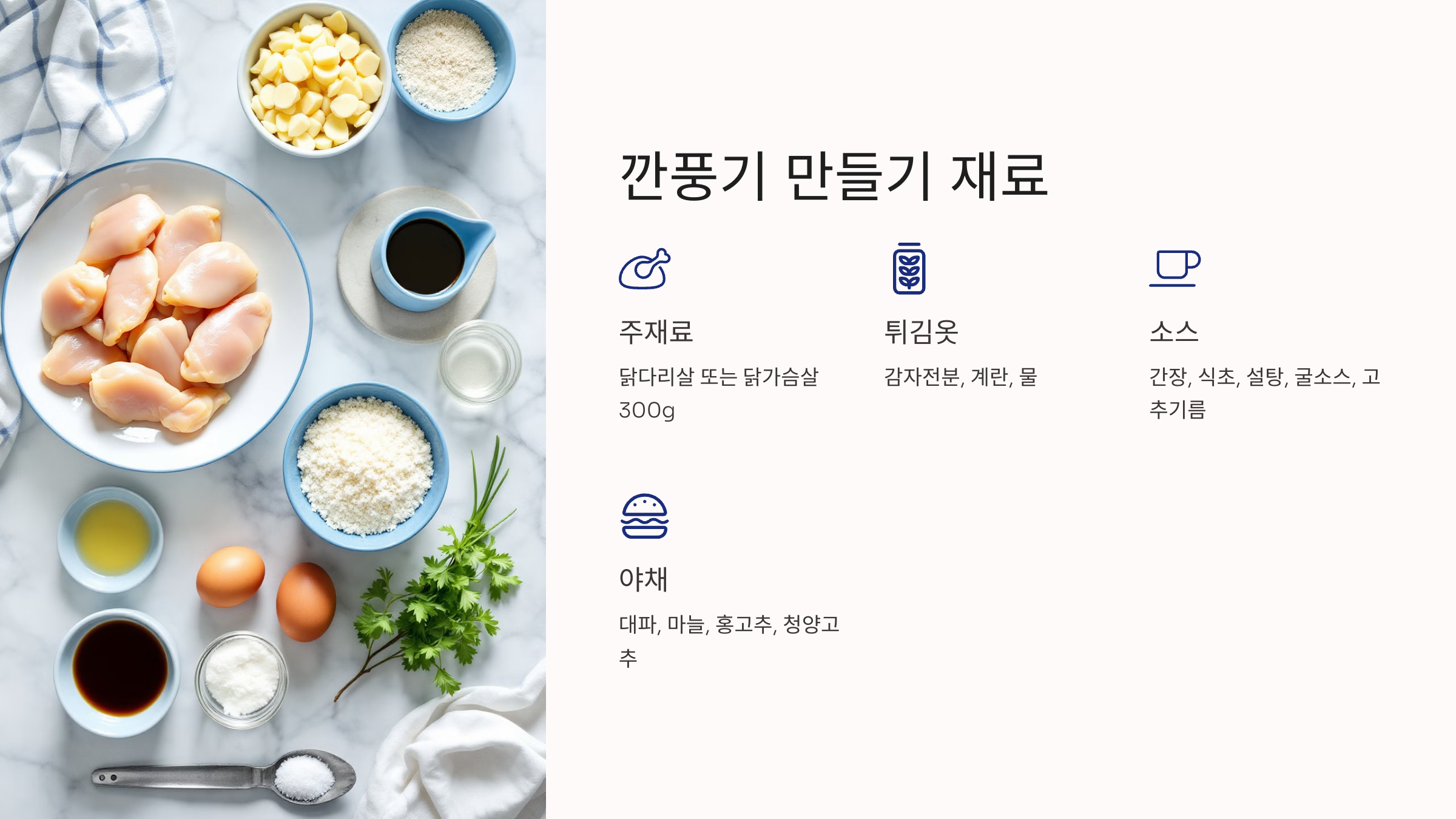 이제 깐풍기가 어떤 요리인지 알았으니, 맛있는 깐풍기를 만들기 위한 재료를 알아볼까요? 🍗🔥
