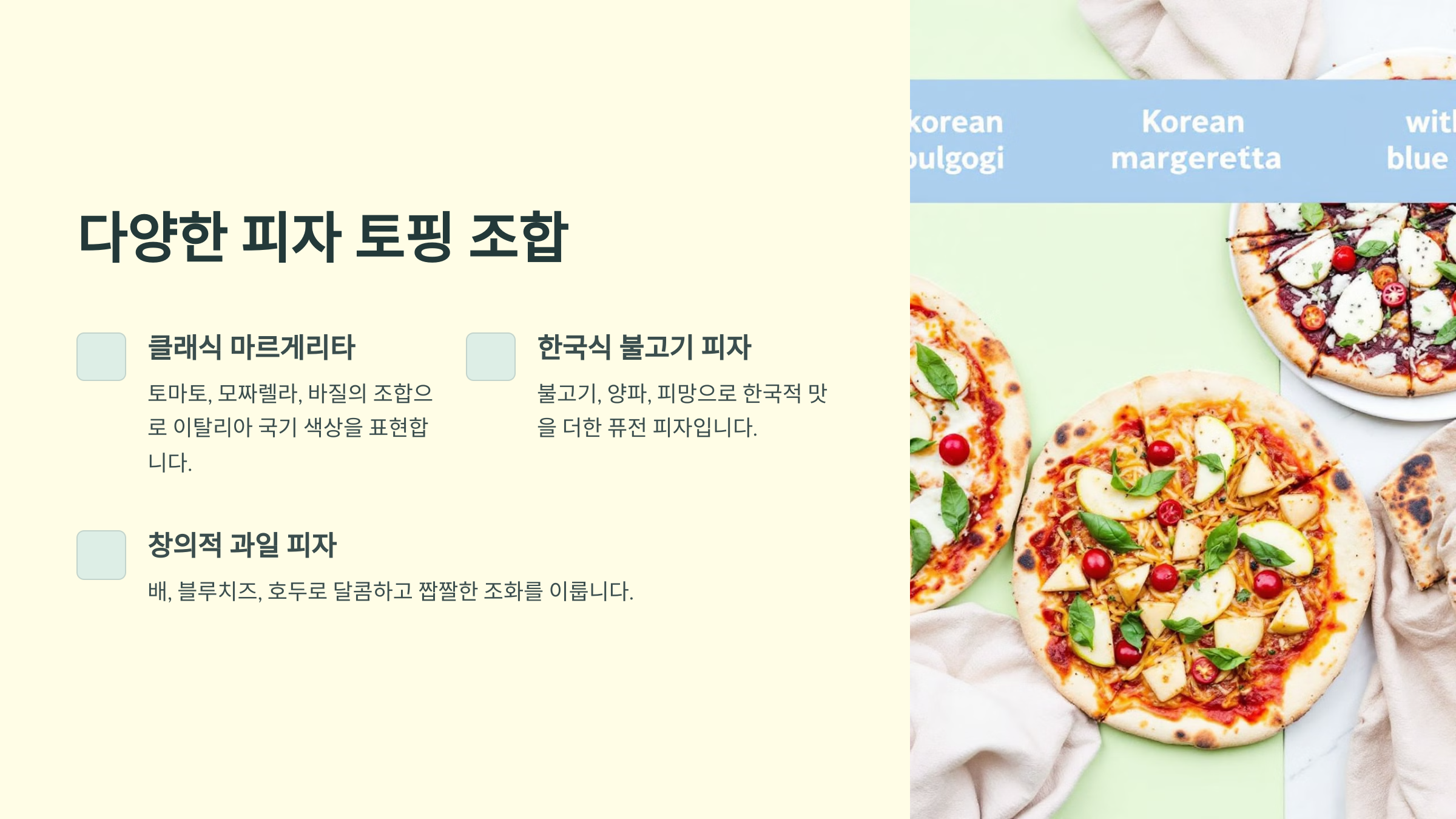 ✅ 이제, 다양한 피자 토핑 조합을 살펴볼까요? 🍕🧀