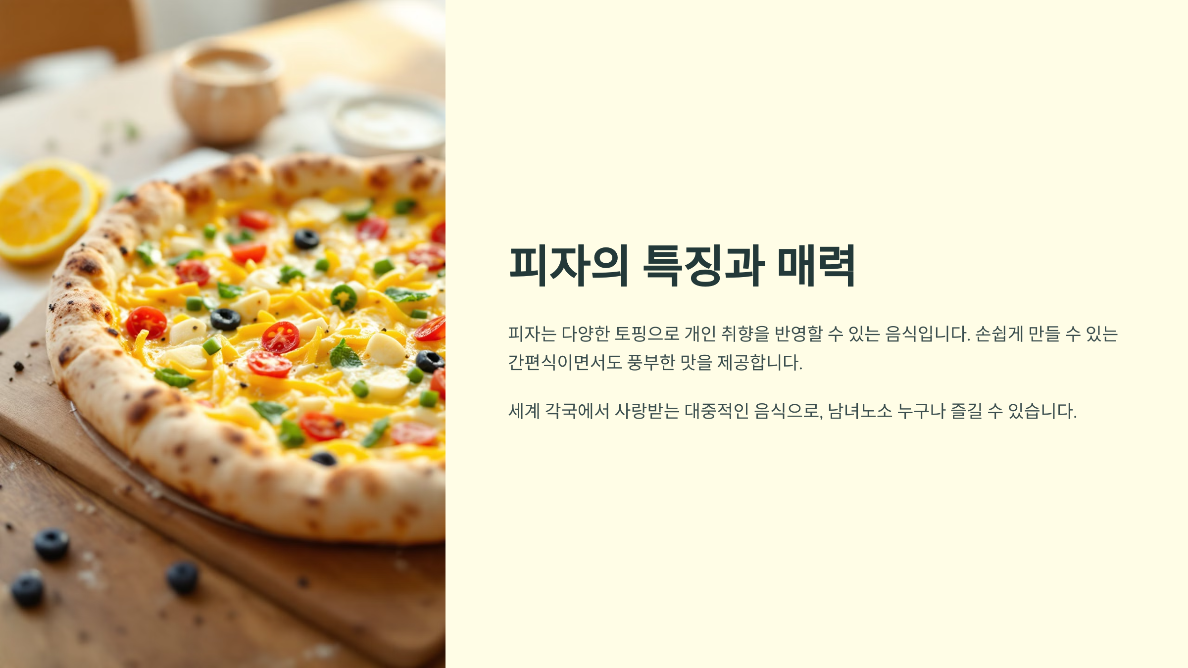 이탈리아에서 시작된 피자는 이제 전 세계적으로 사랑받는 음식이 되었어요. 특히, 집에서 만드는 피자는 내 취향에 맞는 토핑을 올리고, 건강한 재료를 사용할 수 있다는 장점이 있어요.