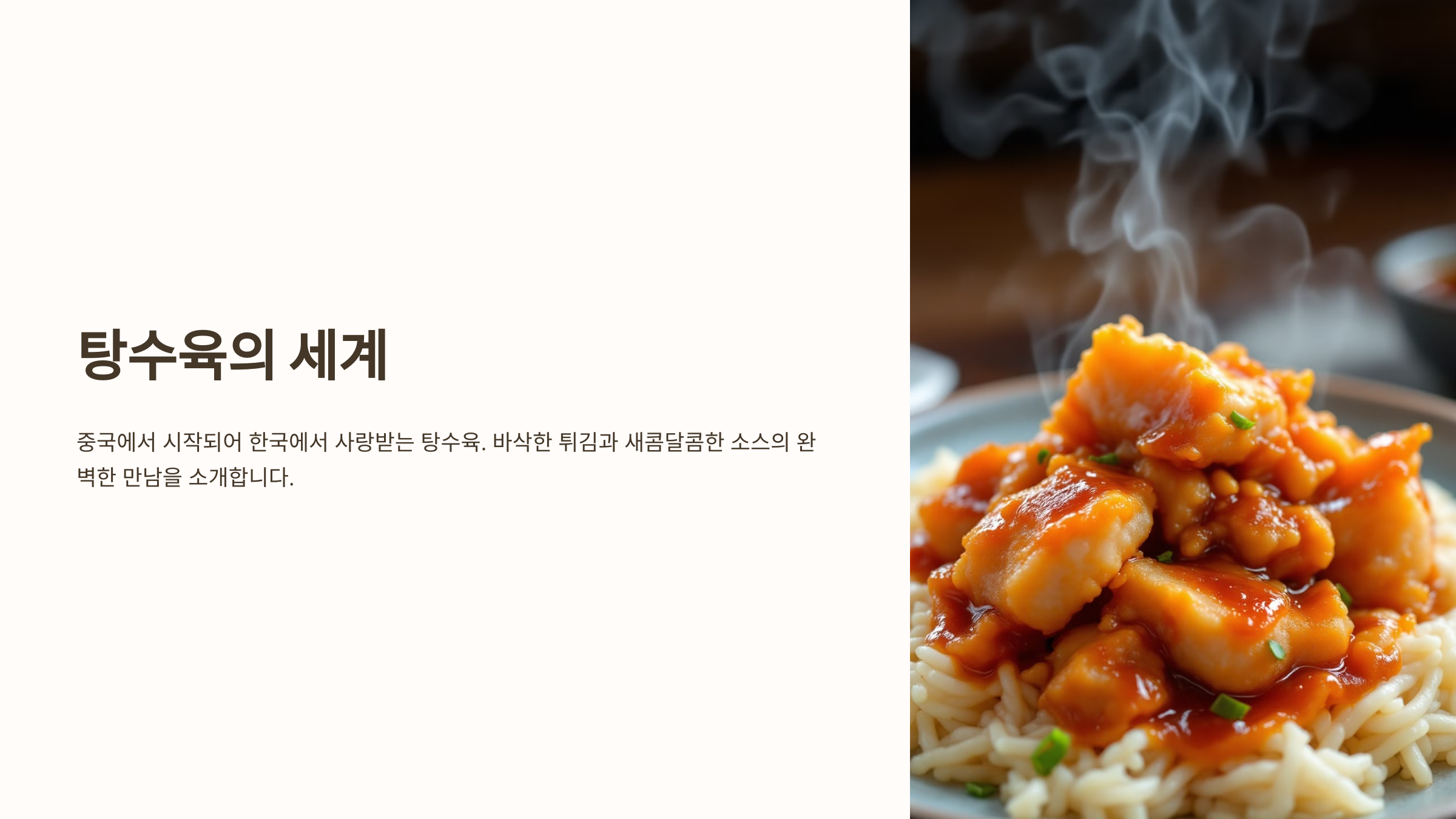 탕수육(糖醋肉)은 겉은 바삭하고 속은 촉촉한 튀김과 새콤달콤한 소스가 어우러진 중국요리의 대표적인 인기 메뉴예요. 🍖🔥 탕수육의 바삭한 식감을 오래 유지하는 것이 성공적인 요리의 핵심!