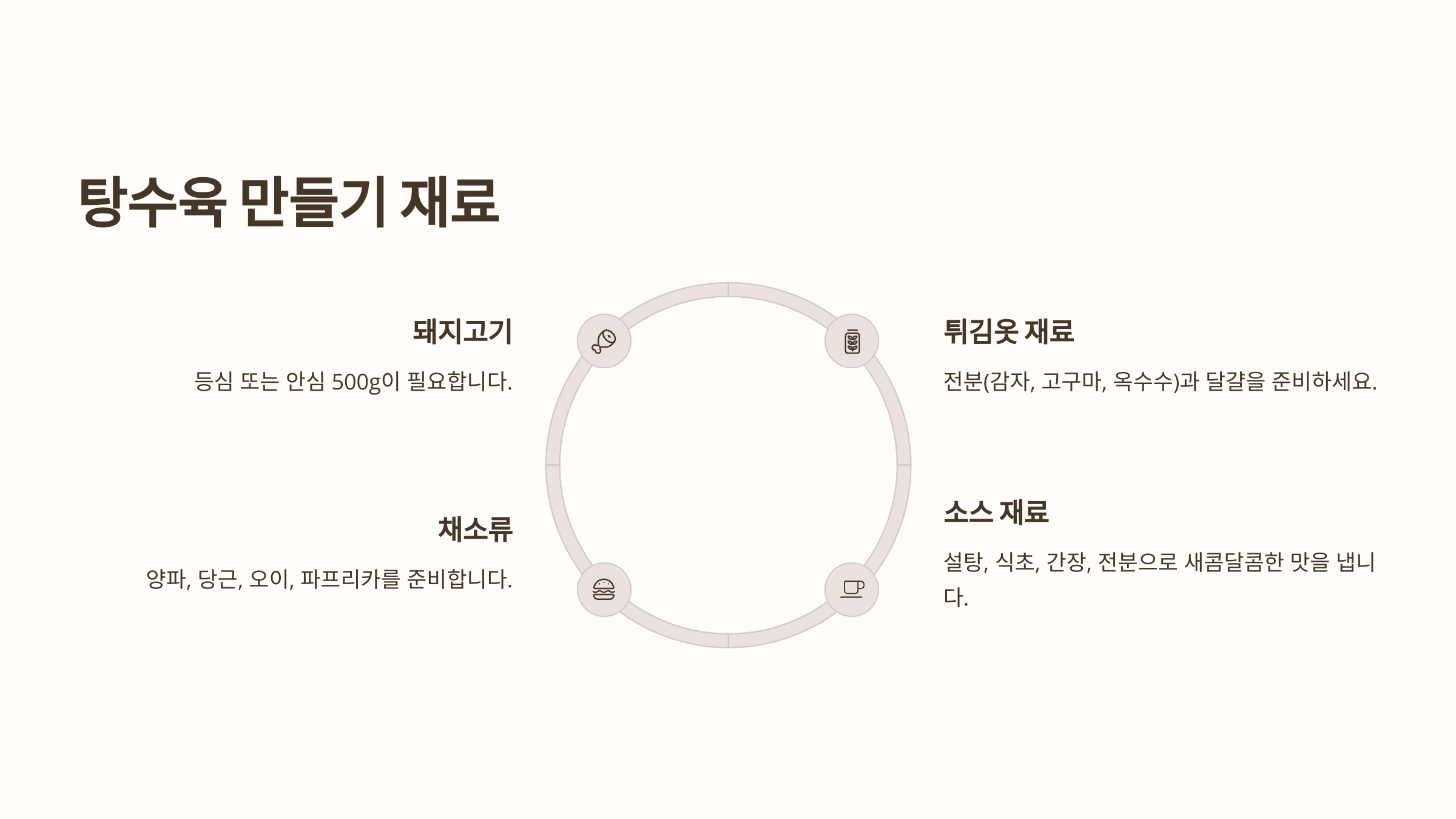 이제 탕수육이 어떤 요리인지 알았으니, 맛있는 탕수육을 만들기 위한 재료를 알아볼까요? 🍖🔥