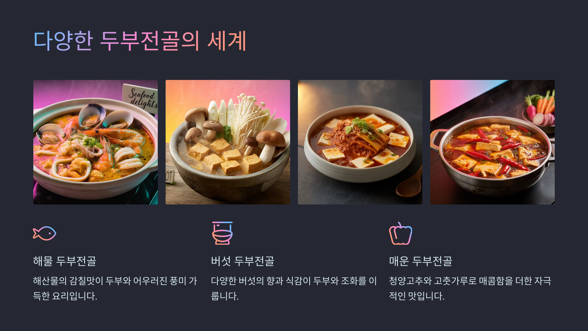| 얼큰 두부전골 | 매콤하고 칼칼한 국물 | 얼큰한 맛을 좋아하는 분 |