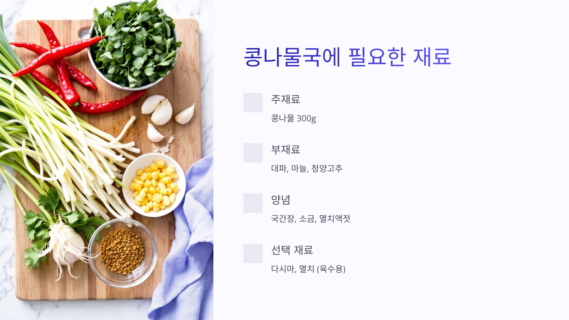 ✅ 이제 콩나물국을 만들기 위해 필요한 재료를 살펴볼까요? 🛒