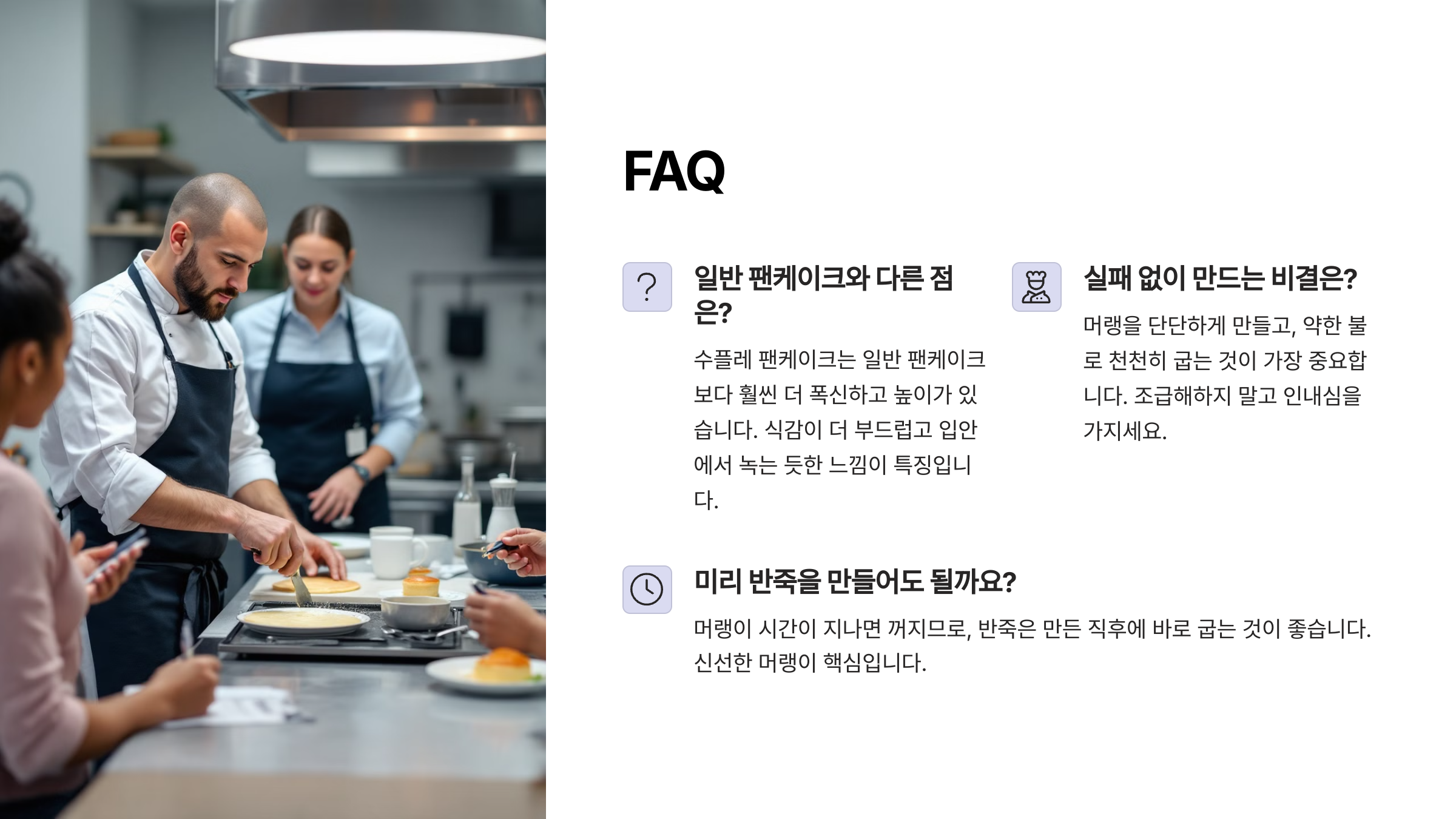| 바로 먹기 | 수플레 팬케이크는 시간이 지나면 꺼지므로 바로 먹어야 해요! ⏳ |