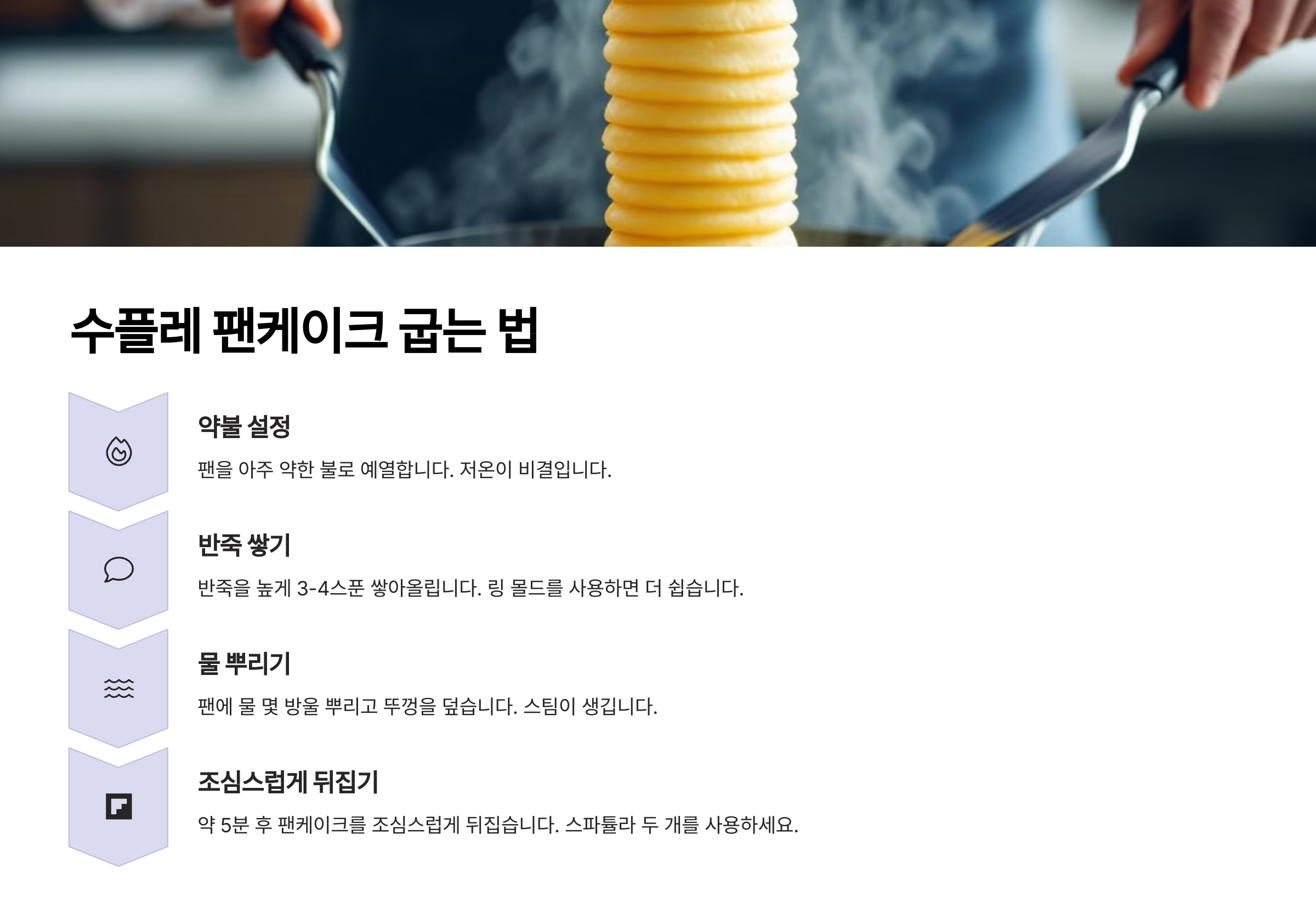| 팬을 너무 달구지 않기 | 약불에서 천천히 익혀야 폭신한 식감을 유지할 수 있어요. 🔥 |