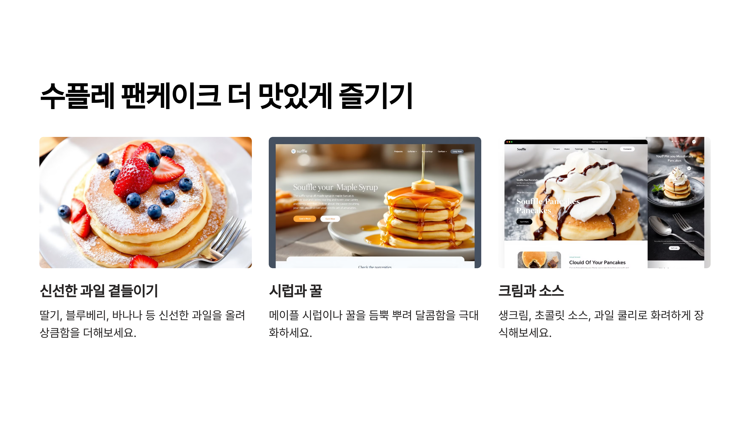 폭신한 수플레 팬케이크는 어떤 토핑을 곁들이느냐에 따라 색다른 맛을 즐길 수 있어요! 기본적인 메이플 시럽부터, 특별한 디저트 스타일까지 다양한 조합을 소개할게요! 🥞✨