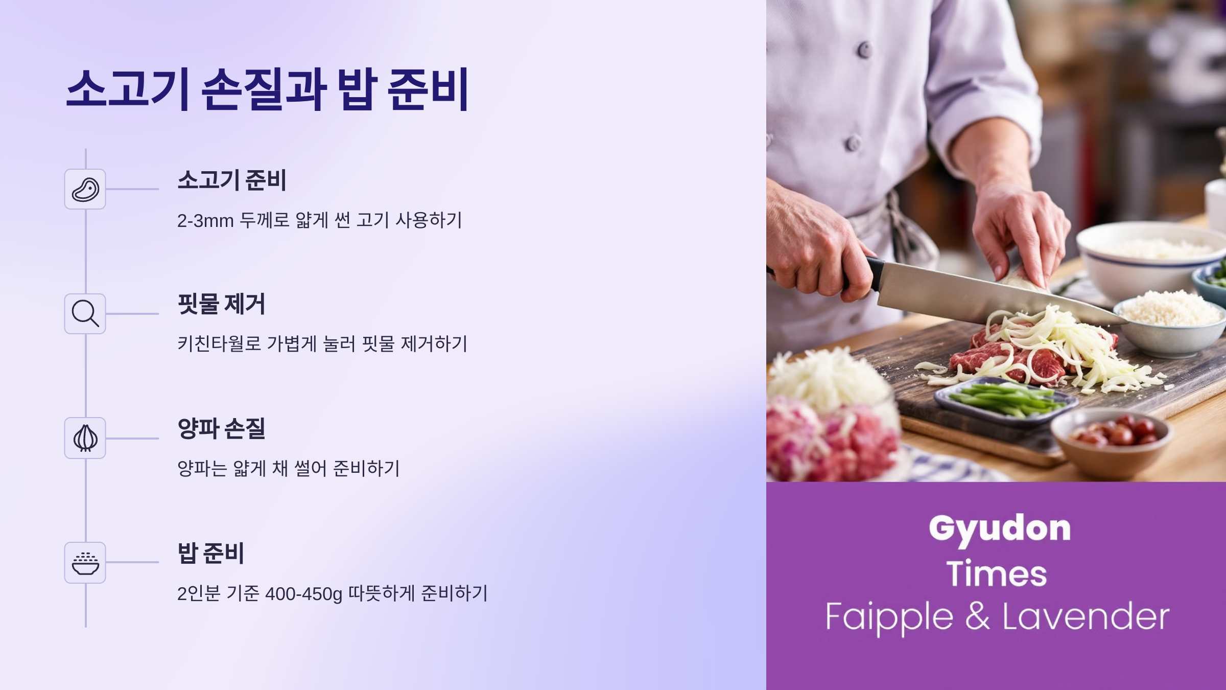 규동의 핵심은 부드러운 소고기와 고슬고슬한 밥이에요. 고기를 올바르게 손질하고, 밥을 맛있게 지어야 레스토랑급 규동을 만들 수 있답니다! 🥩🍚