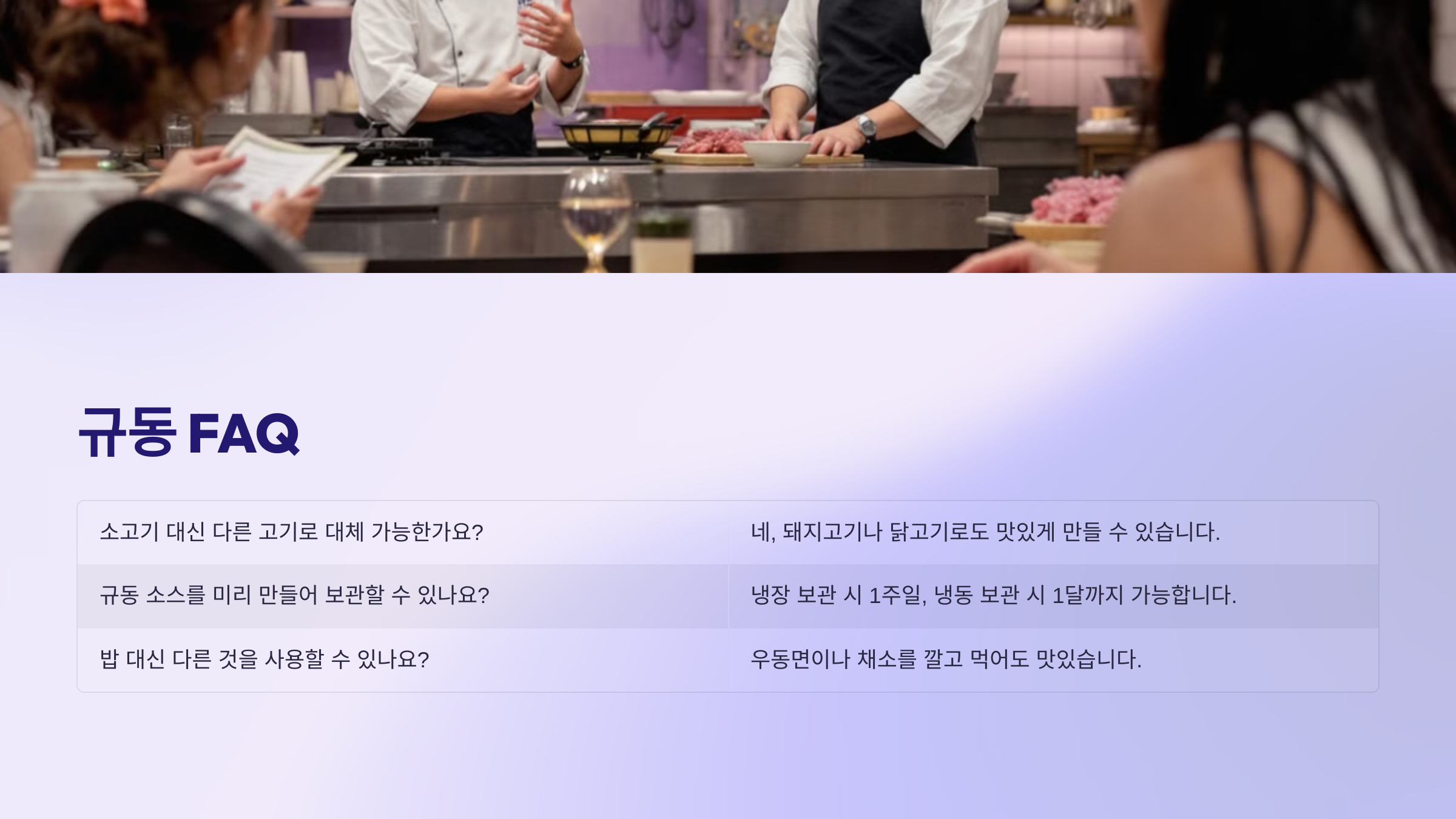 A7. 가능하지만, 갓 만든 규동이 가장 맛있어요! 전날 만들어 놓고 먹을 경우, 소스와 고기를 따로 보관하고, 먹기 직전에 데우는 것이 좋아요.