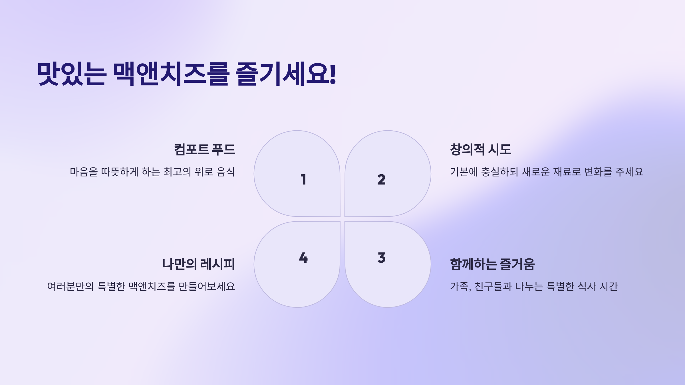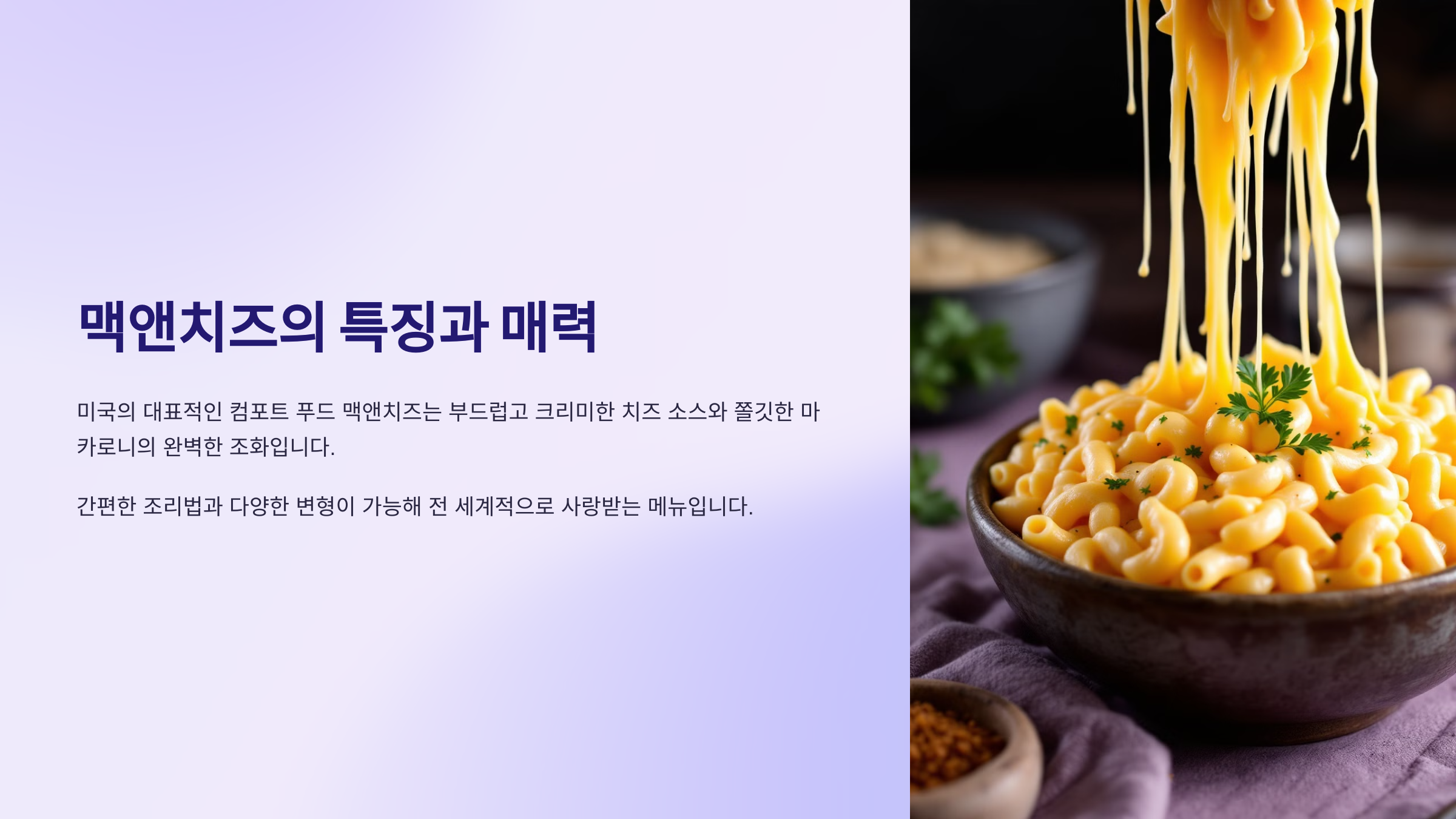 치즈의 종류, 녹이는 방법, 부가 재료 등을 잘 활용하면 더욱 깊고 풍부한 맛을 낼 수 있어요. 이제 맥앤치즈의 치즈 맛을 극대화하는 꿀팁을 소개할게요! 😊
